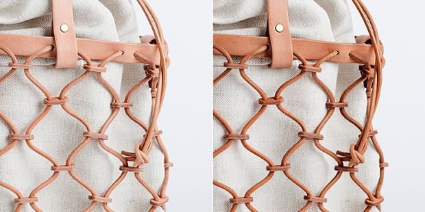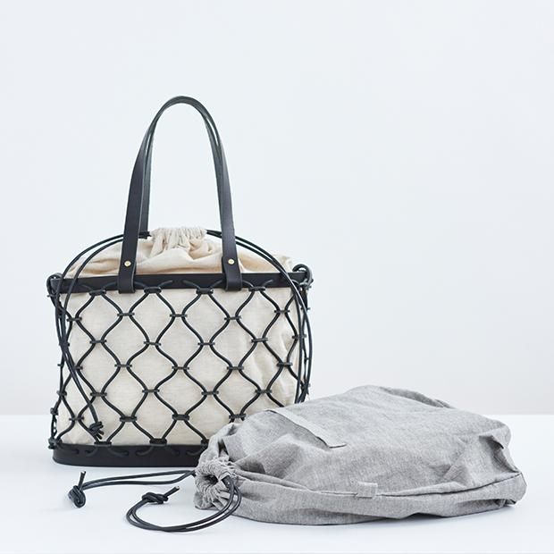 革紐を組み合わせて編んだ革カゴバッグ。