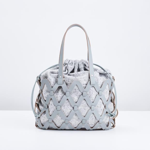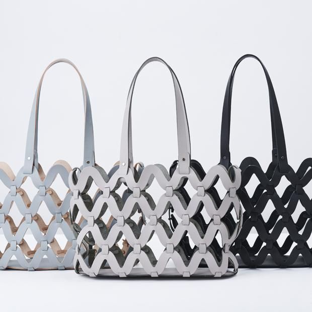革のパーツを組み合わせて、ウネウネと透かし状に組みあげました。